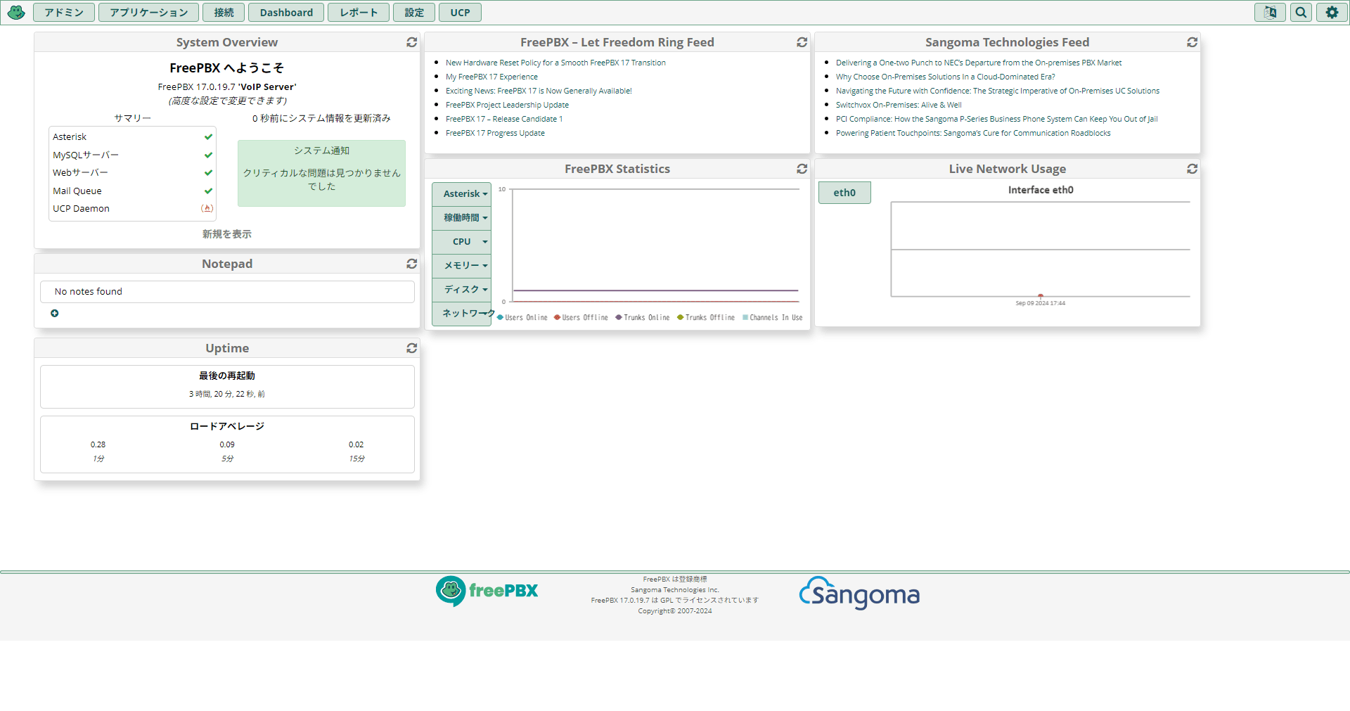おことわり AlmaLinuxをあえて使うメリットはありません SIPなど標準ポート(5060)で動かすのはセキュリティ的に良くないので、適宜置き換えてください 「とりあえず動いた」の程度なので、ちゃんと動かしたい場合はDebianで公式のインストーラーを使った方がいいと思います 細かい解説はしません(できません) Asterisk / FreePBXがある程度分かってる人向けです(が、私はあまり分かっていません) KAGOYA CLOUD VPSの2コア/2GB/25GBで検証しています FreePBX標準?のファイアウォールは使用できません UCPのエラーログが出ます(解決方法わかりません) KAGOYAのVPSを使うことが要件だったので、今回AlmaLinux 9をあえて採用していますが、Debianを使える環境であれば、間違いなく公式のインストーラーを使うべきです。